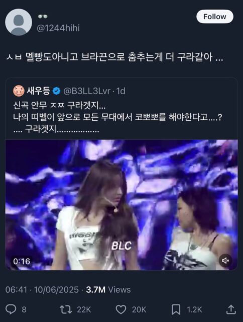 The controversy didn’t end with choreography. During a recent performance, member Belle wore a sheer bodysuit with detailing that many fans compared to lingerie. A clip of her executing the bra-strap dance move while wearing the outfit further inflamed the discussion.