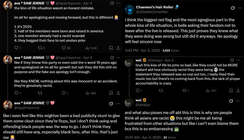 At Julie birthday live in 2025, KISS OF LIFE members showed up wearing cornrows, Bantu knots, oversized gold chains, and baggy ‘90s-style clothing. Belle wore bandana-print accessories and rapped lyrics from “Pound Town” by Sexyy Red. Natty stacked two caps on her head. The group adopted exaggerated hand gestures, stylized speech patterns, and poses heavily associated with outdated and harmful portrayals of Black hip-hop artists.