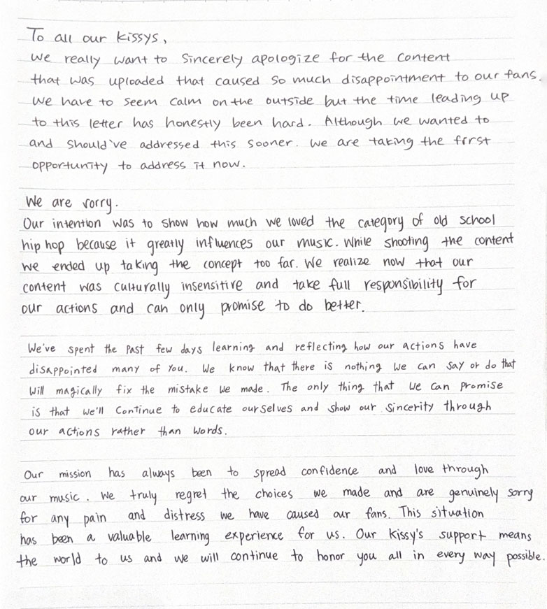 After days of growing backlash, on April 5, the group posted a handwritten apology letter on their official social channels. Each member wrote a paragraph. They expressed regret, admitted they had gone “too far,” and took “full responsibility” for the culturally insensitive content.