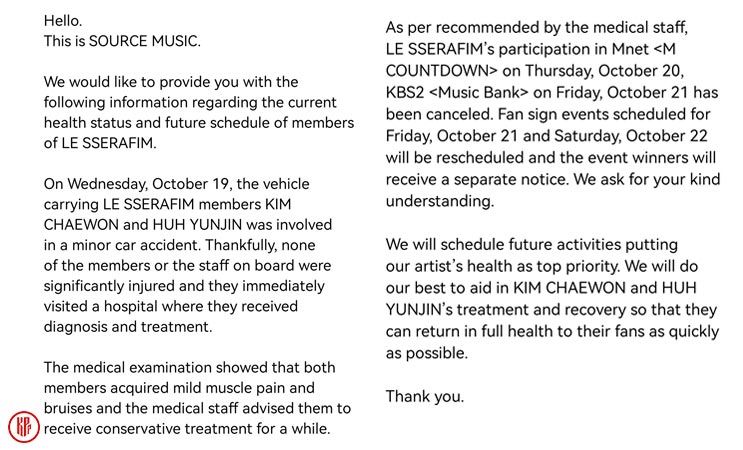Further in the announcement, Source Music explained that both Chaewon and Yunjin only suffered from minor injuries.