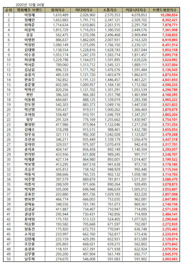 The institute has collected 203,316,792 big data of 50 Korean movie star brands from September 4, 2021, to October 4, 2021. Compared to the 118,451,209 big data brand in July 2021, it increased by 71.65 percent.
