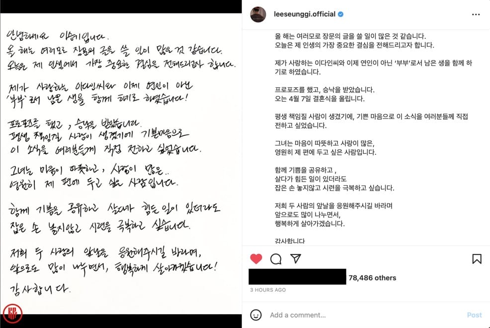 On February 7, Lee Seung Gi posted a handwritten letter on his personal Instagram announcing his plan to marry his girlfriend, actress Lee Da In.