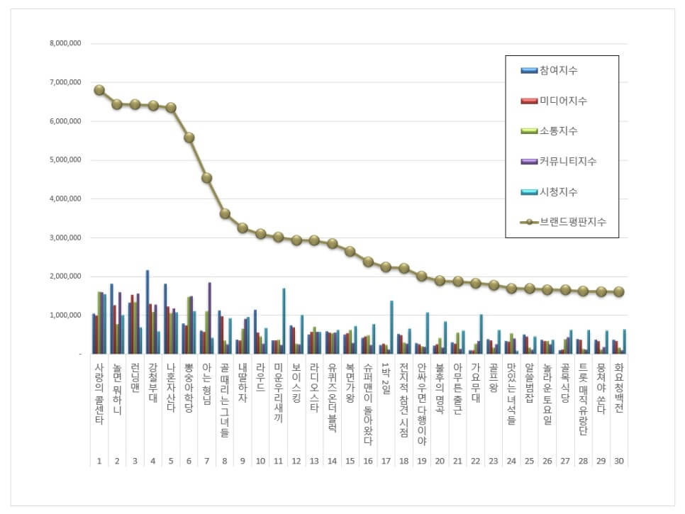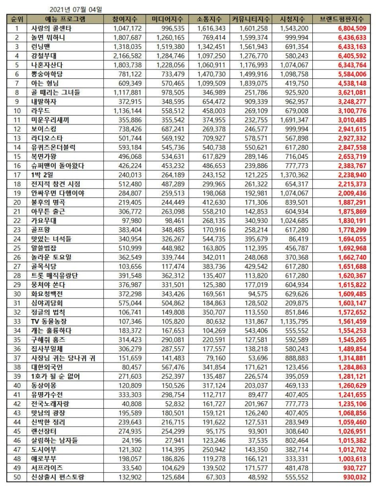 The Korea Corporate Reputation Research Institute has analyzed 119,655,556 big data of 50 brands of the most popular variety shows from June 4, 2021, to July 4, 2021. Moreover, the analysis consists of customer participation, media coverage, interaction, community awareness, and viewership indexes of 50 popular variety shows. Compared to 167,898,797 big data for variety show brands in June, it decreased by 28.73%.