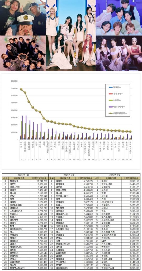 Check out the top 5 and 30 Kpop idol groups in January, February, and March 2025.