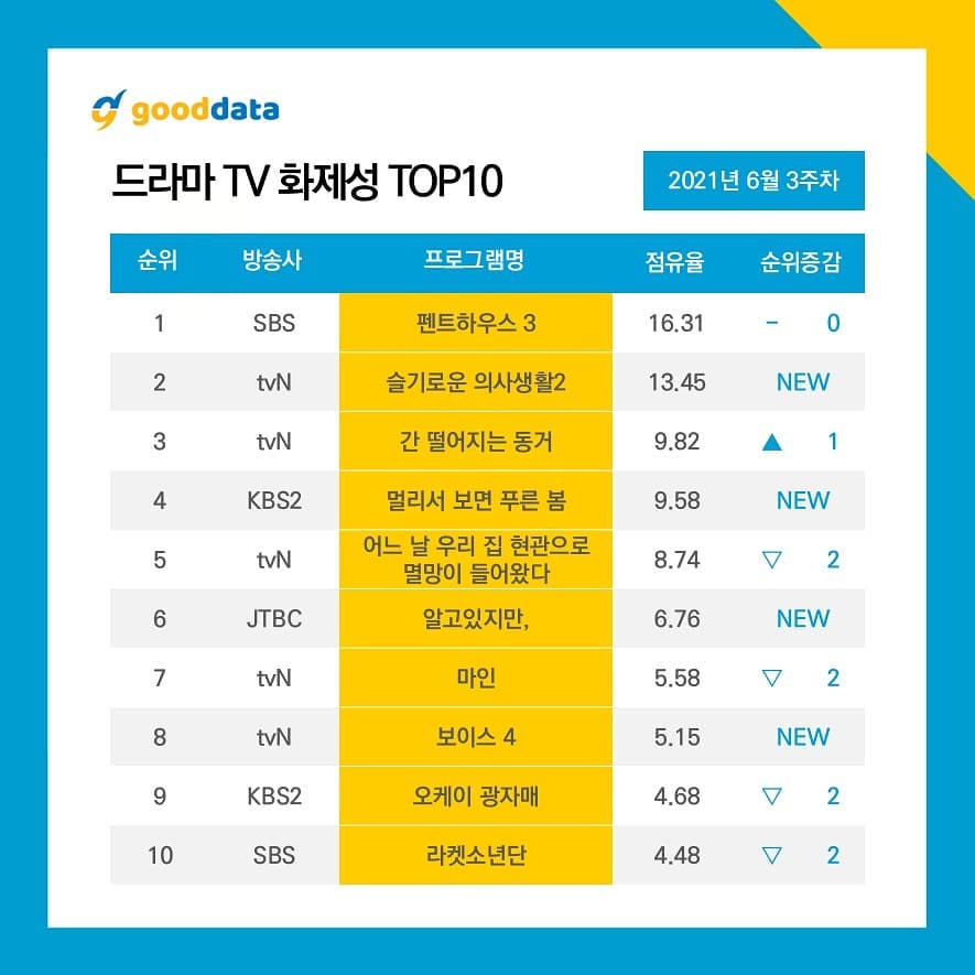 SBS’s “Penthouse 3” remained on #1, followed by a new season of tvN’s drama “Hospital Playlist 2” on the most talked about Korean drama by Good Data.