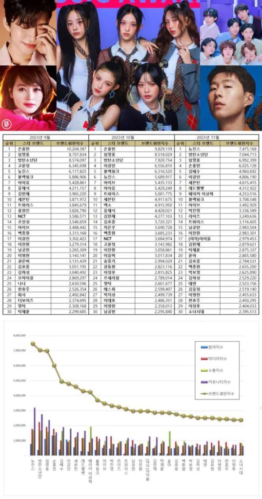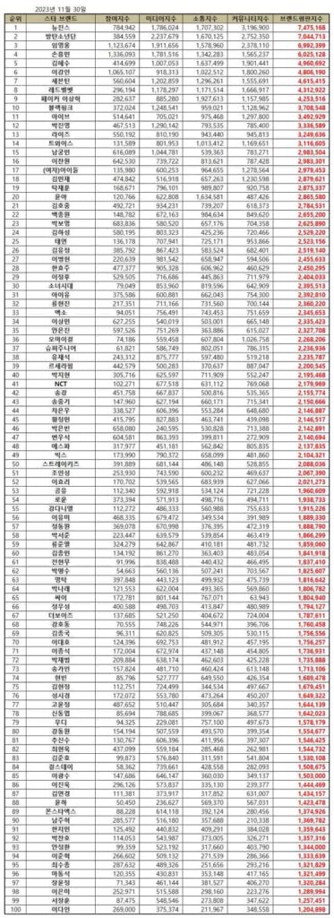 On November 30, the Korean Business Research Institute revealed the most recent rankings of top Korean star brand reputations. This comprehensive list encompasses a wide range of talented individuals, including singers, trot singers, movie stars, drama actors, idols, and sports icons. Discover the top 100 Korean star brand reputation rankings for the most popular Korean stars in November 2023.