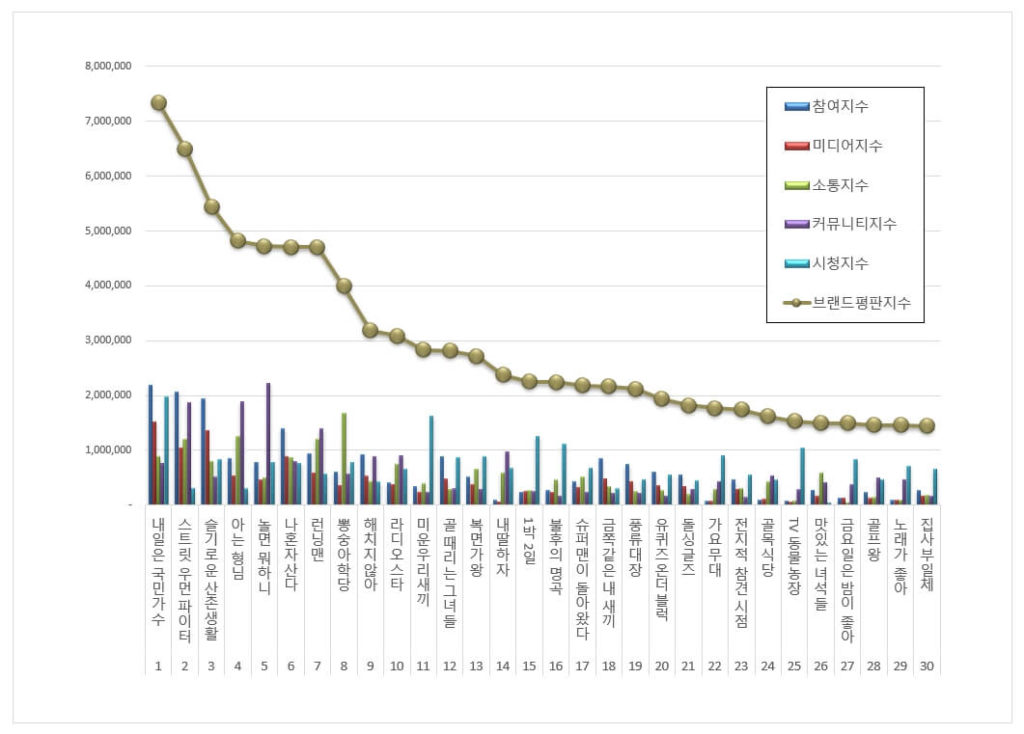 TV Chosun’s new show, “Tomorrow’s National Singer,” premiered on No.1 on the list with a brand reputation value of 7,339,811. In the keyword analysis, the high-ranking phrases were “advance to finals,” “unpredictable,” and “death match.”