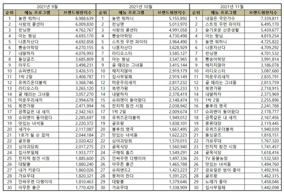 Here are the top 30 most popular variety show brand-reputations rankings from September to November 2021.