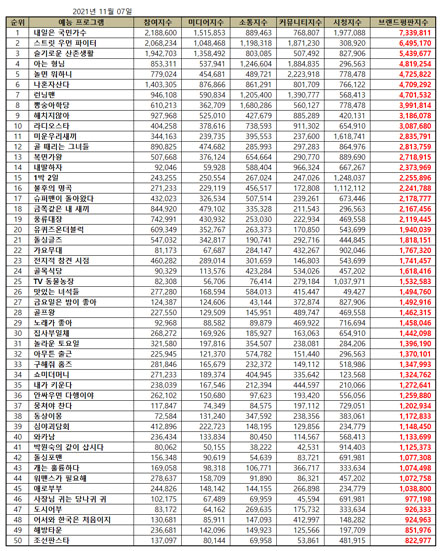 The Korea Corporate Reputation Research Institute has analyzed 110,491,694 big data of the 50 most popular entertainment shows in South Korea from October 7, 2021, to November 7, 2021. The analysis consists of customer participation, media coverage, interaction, community awareness, and viewership value of 50 popular variety shows. Compared to 98,911,800 big data for variety show brands in October, it increased by 11.71 percent.