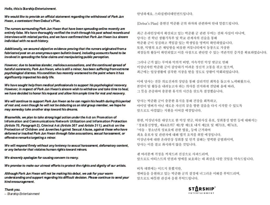 Yet, despite the retraction and a handwritten apology from the original poster, the damage was already irreversible. And instead of focusing on repairing his reputation before the allegations blew up, Starship now must settle with Park Jun Hwan leaving IDID even before his debut.