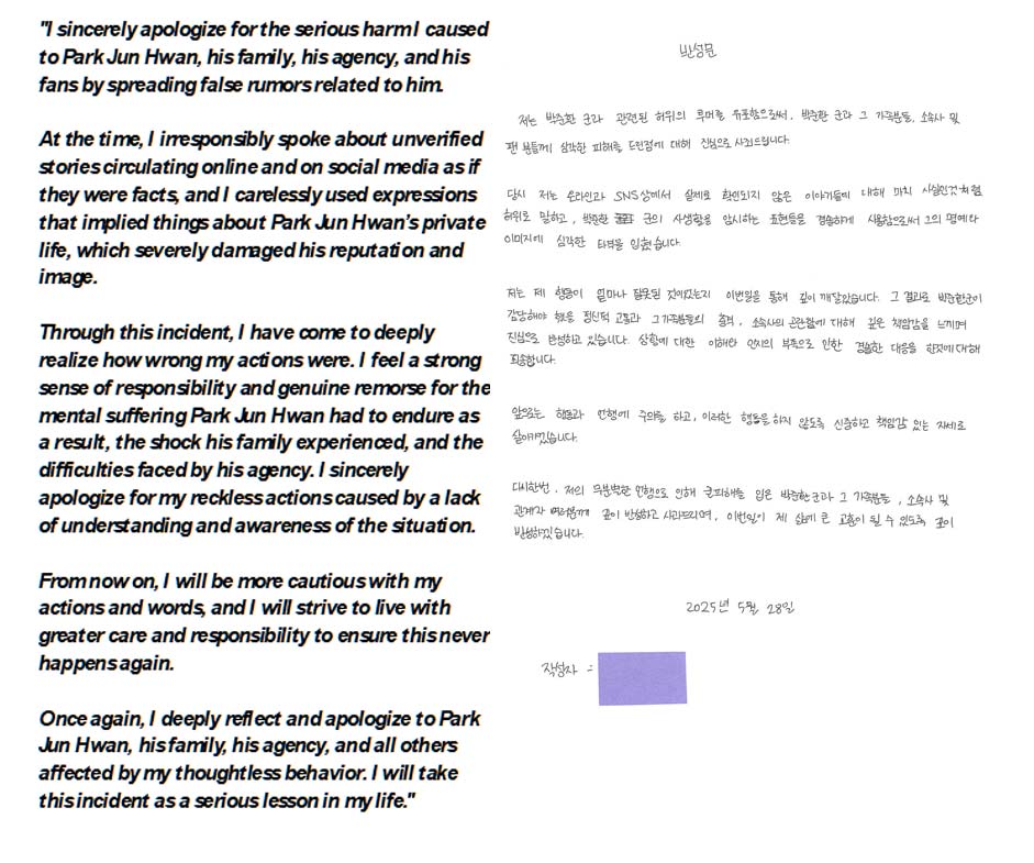 Meanwhile, the perpetrator’s apology letter, dated May 28, reads like many others before it: sincere, ashamed, and full of regret. They admitted having irresponsibly repeated rumors found online, unknowingly causing deep harm to Park Jun Hwan, his family, IDID, and Starship Entertainment.