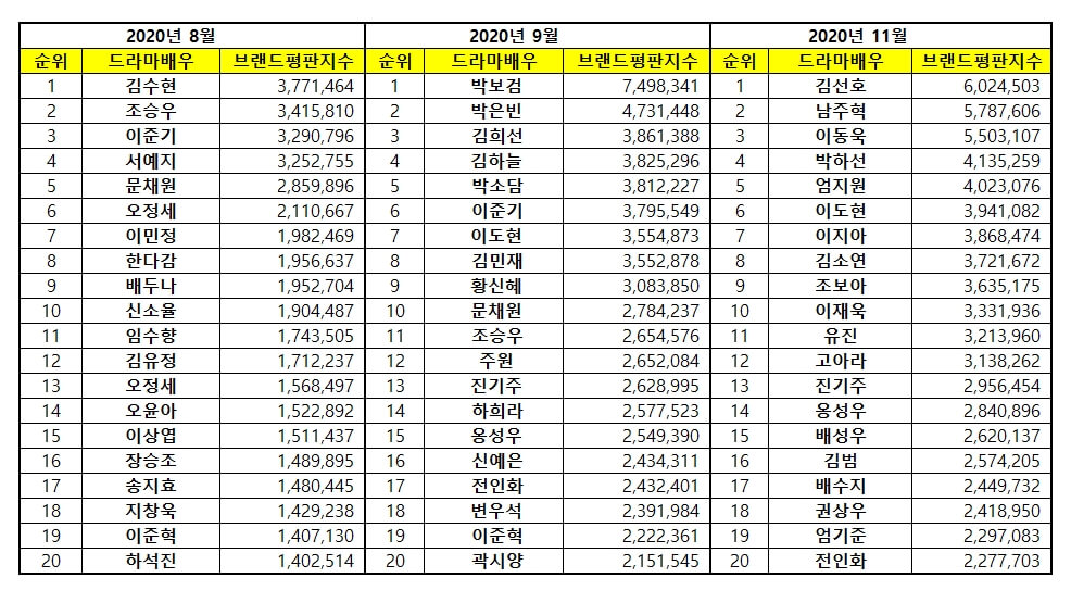 The top 20 Korean drama actors Brand Reputation Rankings for November 2020