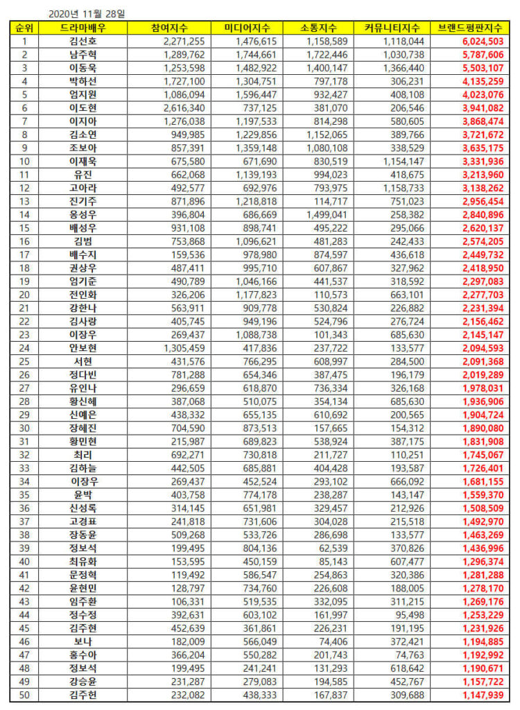 The Korean Business Research Institute has analyzed 119,147,284 big data of 50 Korean drama actors who appeared in dramas that aired between October 28 to November 28. The rankings are based on consumer participation, media, communication, and community indexes. Compared to 106,557,175 big data of Korean singers brand in September, it increased by 11.82%.