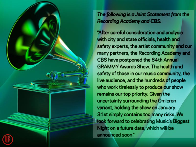 Both CBS and the Recording Academy concluded that it’s too risky to carry on with the GRAMMYS’ original schedule. Therefore, the 2022 Grammy Awards ceremony is officially postponed, and the academy will give further updates soon.