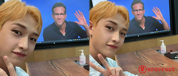 In the Instagram caption, Stray Kids Bang Chan shoutout his version of promotion for the movie while posing with Ryan Reynolds virtually.