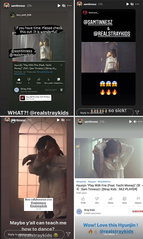 In addition to his tweets, Sam Tinnesz also posted on his official Instagram account and multiple stories praising Hyunjin’s performance. He also made an offer for collaboration and made a song some time.