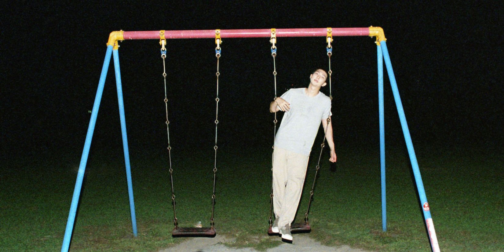 The concept photos evoke the style of pictures taken with a disposable camera. RM is captured in straightforward settings in Tokyo — a parking lot, beside a tree, and on a swing set at a playground — looking directly at the camera and sometimes offering a smile.