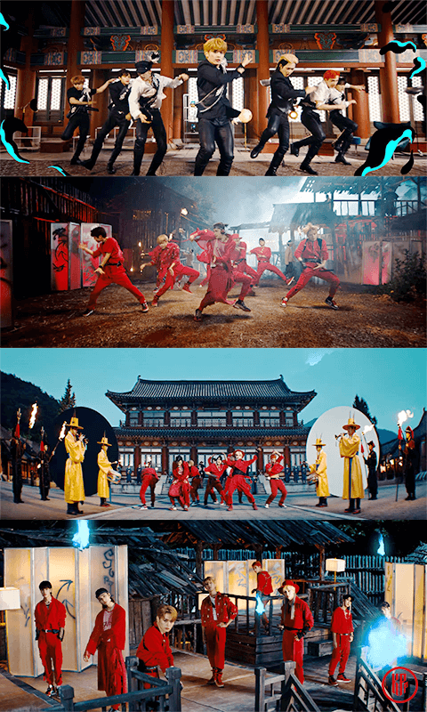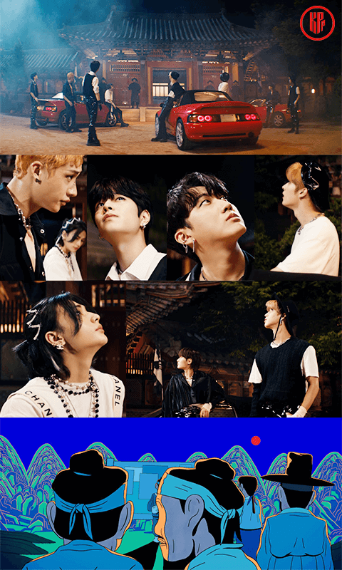 In the beginning, you would see how all Stray Kids members appeared in red sports cars, gazing at the gate of what seemed to be a traditional palace. Then as they looked up, lighting and thunder started rambling up in the sky, and historical animation with a red moon started appearing.