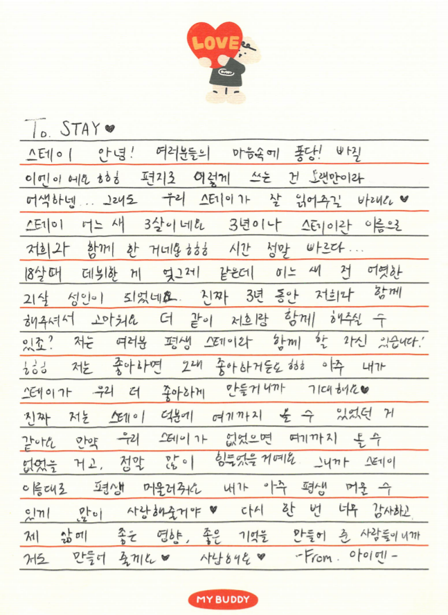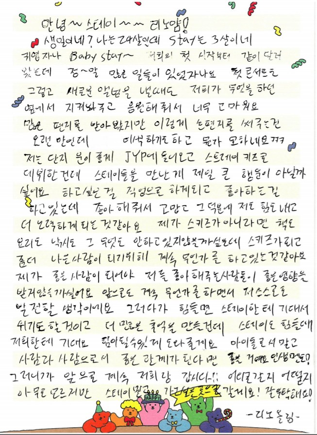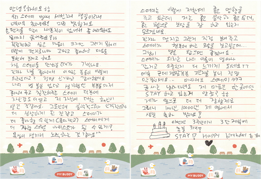 “HELLO! It’s already STAY’s third birthday! Congratulations! Let me be honest, I’ve rarely written handwritten letters before, so please hold tight and read till the end even if it’s a little clumsy! Haha