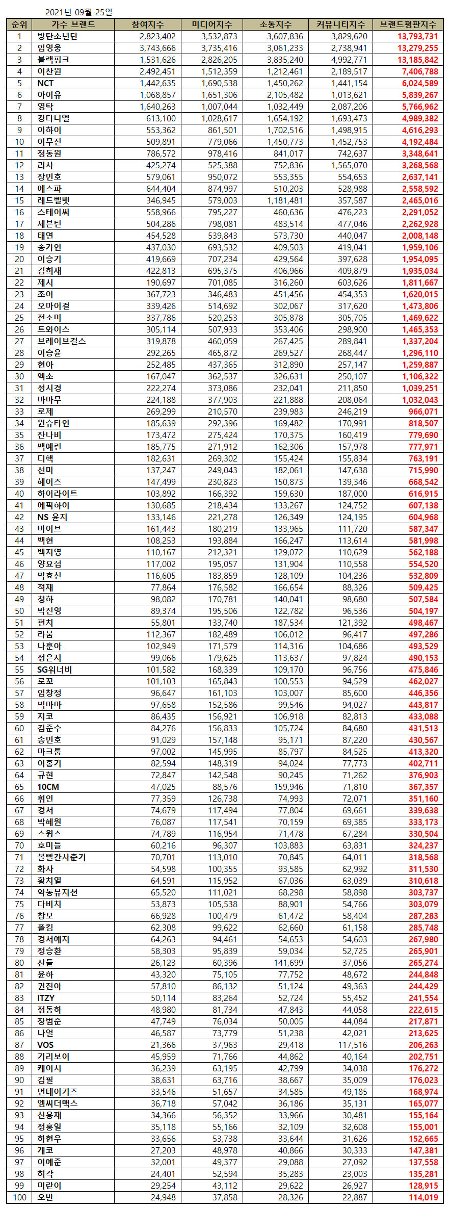 - The Top 100 Individual KPop Idol Brand Reputation Rankings in September 2021