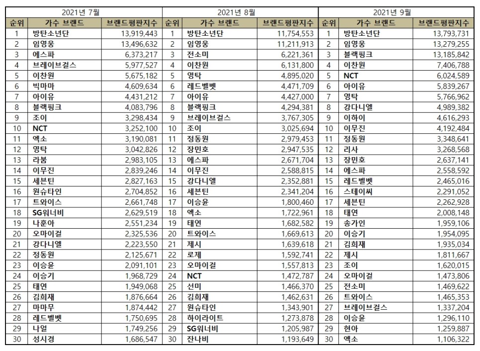 Here are the 30 most popular Korean singers from July to September 2021.
