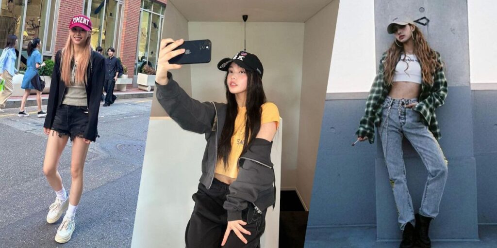 Want to make a bold statement? Take a page from Chuu, ILLIT Iroha, or BLACKPINK Lisa. These idols love mixing edgy streetwear pieces — like cargo pants, graphic tees, baseball cap, and chunky boots — to create looks that are loud, proud, and totally unforgettable.