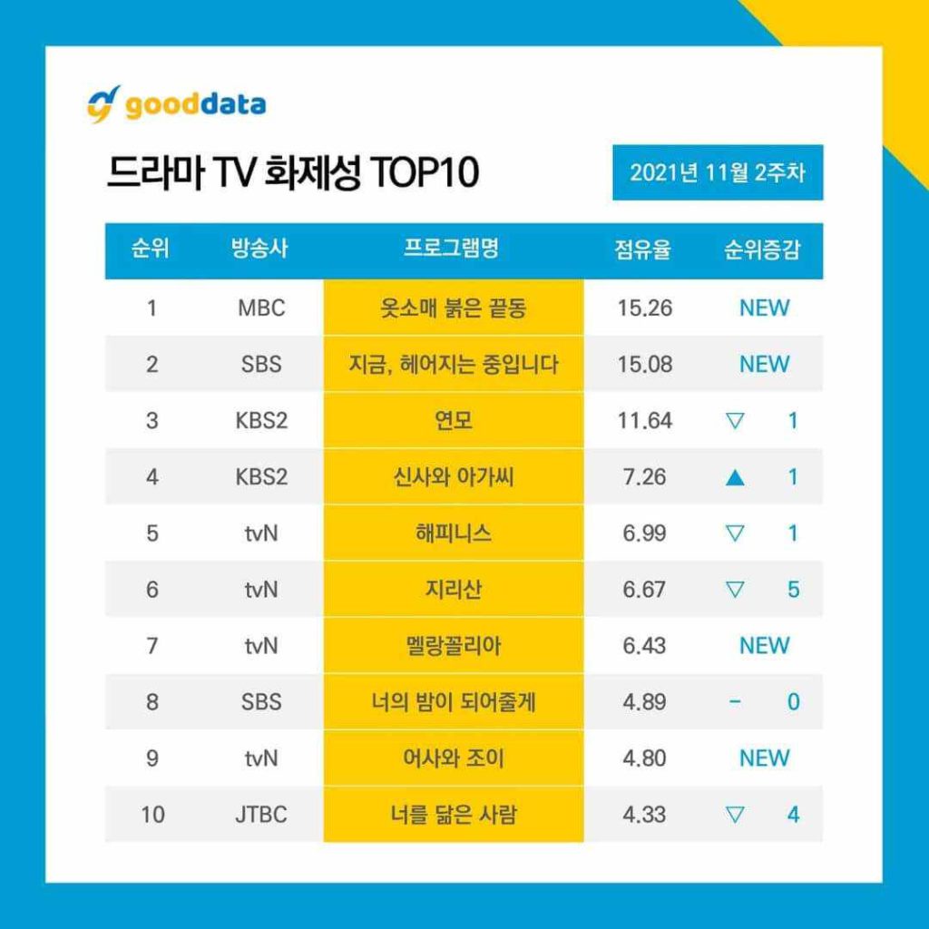Weekly Top 10 Most Talked About Korean Dramas and Actors in the 2nd Week of November 2021 by Good Data Corporation.