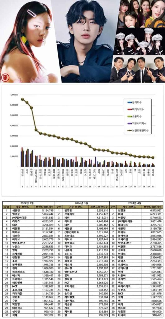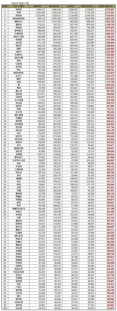 The Korea Business Research Institute analyzed 101,219,103 singer-brand data points from March 27 to April 27, 2024, indicating a 3.27% increase compared to March’s 98,012,844 singer-brand data points. The analysis focused on consumer behavior, examining indices such as brand participation, media coverage, communication, and community engagement to determine the singers’ latest brand value and rank for this month.
