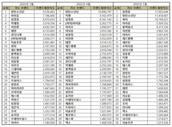 In addition, check out the list of the top 30 most popular Korean singers from March to May 2022.