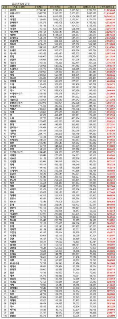 The Korea Corporate Reputation Research Institute has collected and analyzed 137,738,602 singer brand big data from April 21, 2022, to May 21, 2022, to analyze the consumers’ brand participation, media, communication, and community. Compared to the April brand big data of 135,835,516, it increased by 1.40 percent.