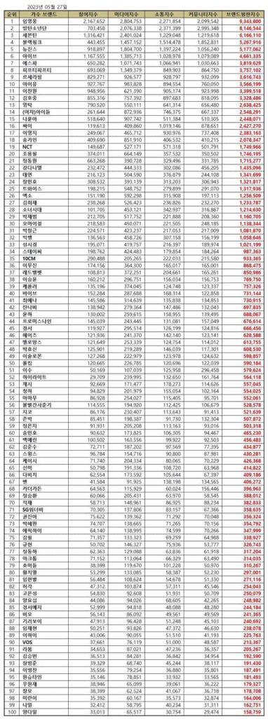 The Korean Business Research Institute has announced the list of the most popular singers in Korea for this month. Below, you will find the Top 100 Korean Singer Brand Reputation Rankings for May 2023.