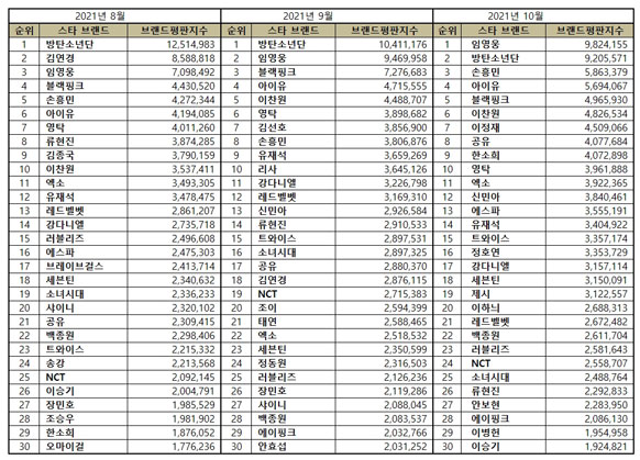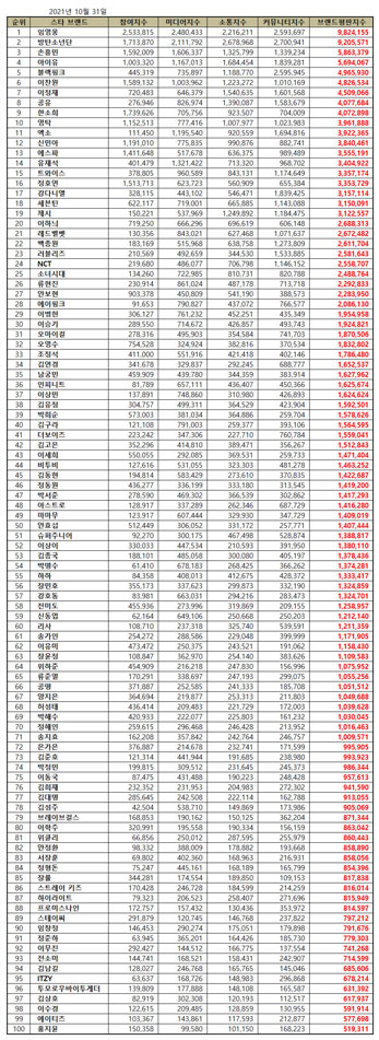 The Korea Institute of Corporate Reputation has collected 193,469,158 big data of the Korean stars from September 30, 2021, to October 31, 2021. Compared to 186,566,328 star brand big data in September, it increased by 3.70 percent.