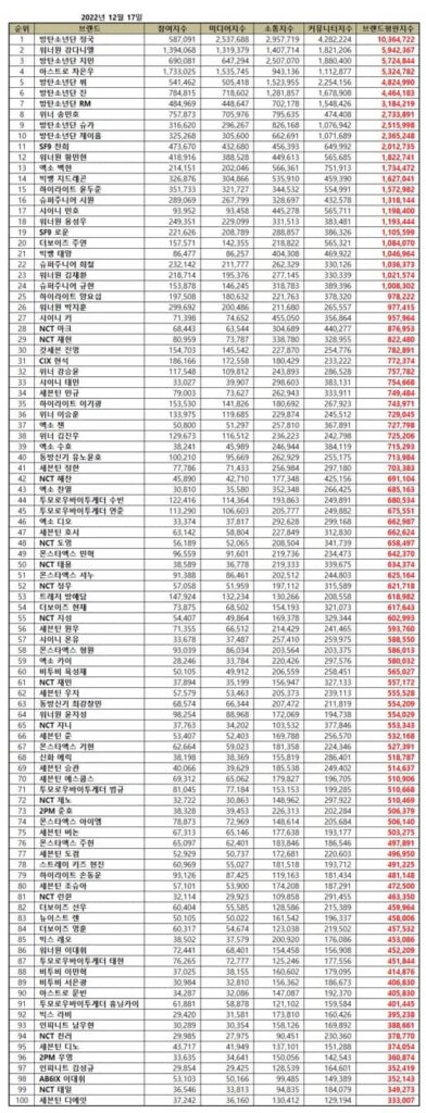 The Korean Business Research Institute has analyzed 110,174,309 brand big data of 703 individual Kpop boy group members from November 17, 2022, to December 17, 2022. However, compared to 107,135,593 big data in November, it increased by 2.84 percent.