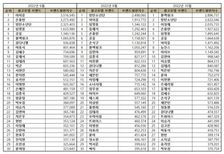 The Korean Business Research Institute analyzed 30,945,362 advertisement model brand big data from September 29, 2022, to October 29, 2022. However, compared to the advertising model brand big data of 35,117,224 in August, it increased by 13.48 percent.