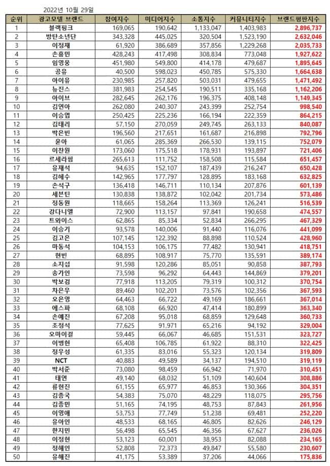 On October 29, the Korean Business Research Institute published the top 50 Korean advertisement model brand reputation rankings in October 2022. The advertisement models include sports figures, actors, actresses, singers, entertainers, Kpop idols, and celebrities. As a result, Kpop girl group BLACKPINK topped the list, followed by Kpop group BTS, Lee Jung Jae, Son Heung Min, and Lim Young Woong at No. 2 to No. 5, respectively. Find October most popular Korean advertisement models below.