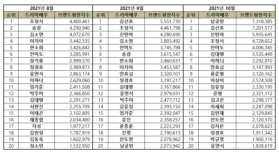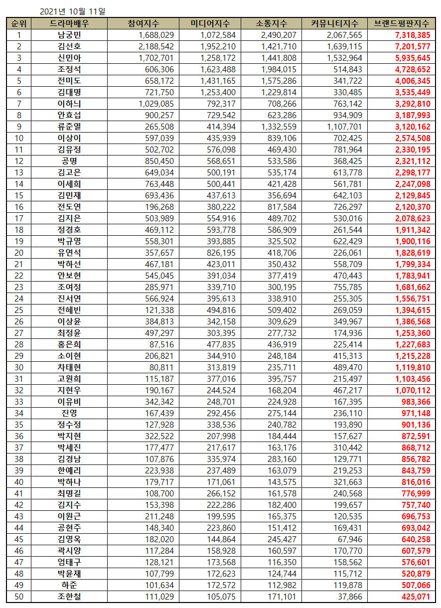 The Korea Institute of Corporate Reputation has compiled 95,975,044 big data of the Korean drama actor brands from September 11, 2021, to October 11, 2021. Compared to the September 99,640,608 brand big data of Korean drama actor brands, it decreased by 3.68 percent.
