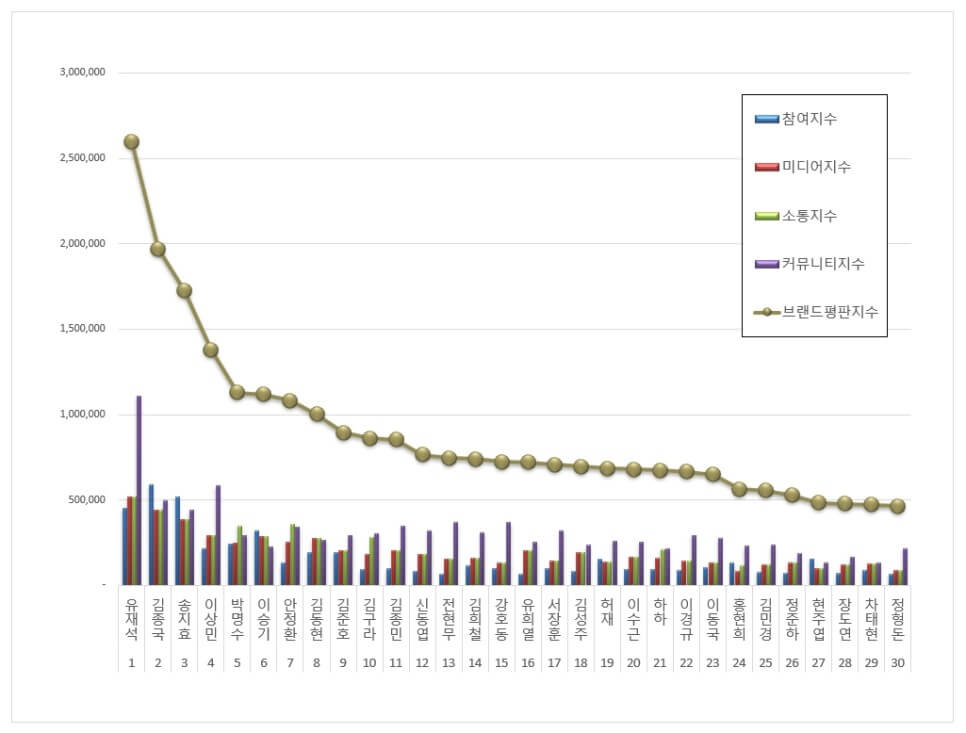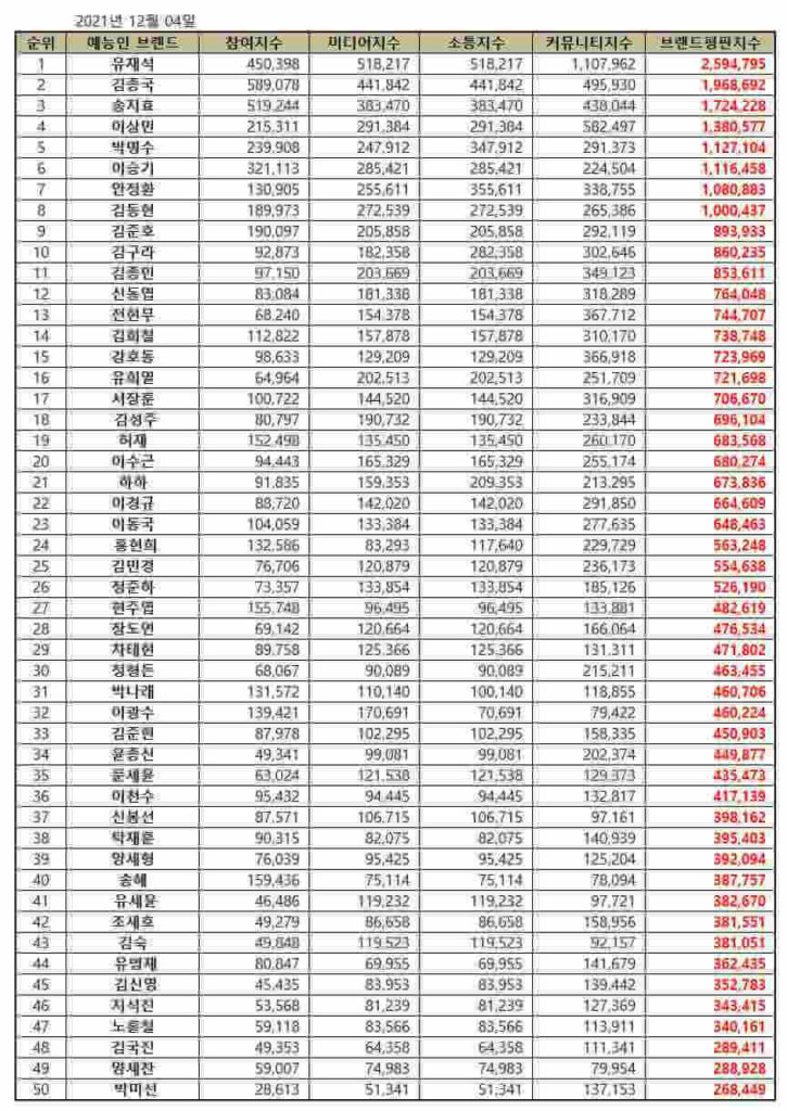 The Korea Corporate Reputation Research Institute has studied 33,956,275 big data of 50 brands of popular entertainers from November 4, 2021, to December 4, 2021. Compared to November variety star brand big data of 32,220,692, it increased by 5.39 percent.