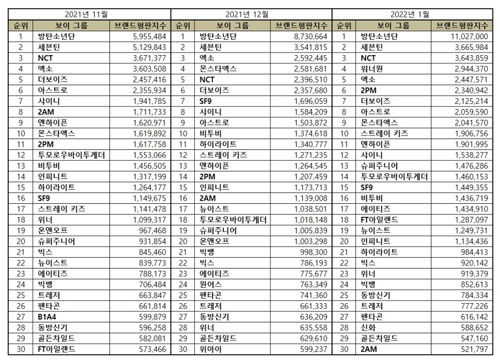 These are the top 30 most popular Kpop boy groups from November to January 2022.