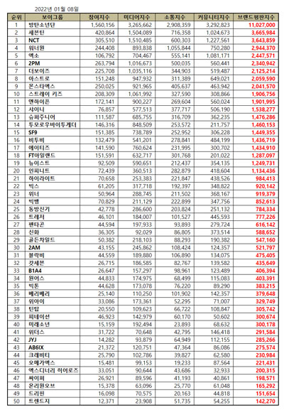 The Korean Business Research Institute has gathered 61,966,657 big data of the Kpop boy group brands from December 8, 2021, to January 8, 2021. Compared to the 53,070,133 brand big data of Kpop male group brands in December, it increased by 16.76 percent.