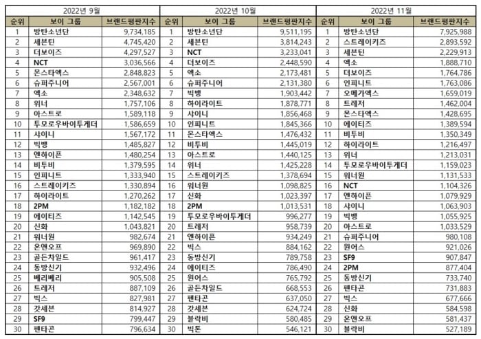 In addition, below are the 30 most popular Kpop boy groups in September, October, and November 2022.