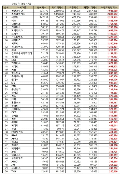 The Korean Business Research Institute has analyzed 50,972,215 boy group big data collected from October 12, 2022, to November 12, 2022. Compared to the 57,455,002 brand big data in October, it decreased by 16.67 percent.