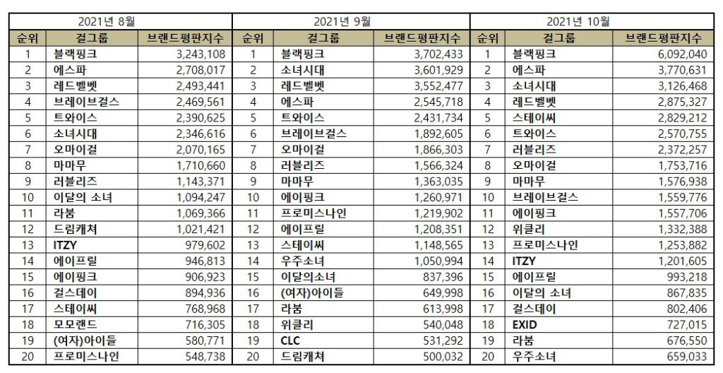 Here are the top 30 most popular Kpop female groups from August to October 2021.