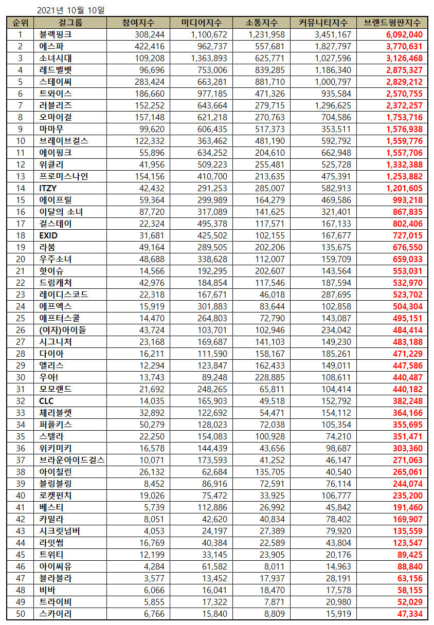 The Korea Institute of Corporate Reputation has compiled 47,766,752 big data of the Kpop female group brands from September 10, 2021, to October 10, 2021. Compared to the 38,256,473 brand big data of Kpop female group brands in September, it increased by 24.86 percent.