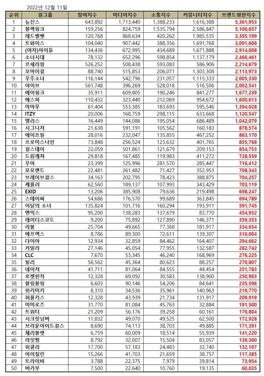 The Korean Business Research Institute analyzed the Kpop girl group brand big data of 51,632,684, collected from November 11, 2022, to December 11, 2022. However, compared to 52,353,317 girl group brand big data last November, it decreased by 1.38 percent.