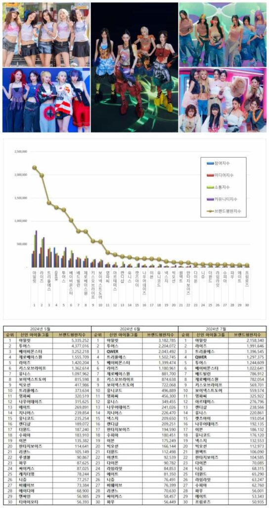 SM Entertainment’s Kpop female group, aespa, who recently made a comeback with “SUPERNOVA,” secured the top spot in July’s Kpop female group rankings. Their brand reputation index surged by 14.41%, rising from 5,409,956 in June to 6,189,495, with the following breakdown: