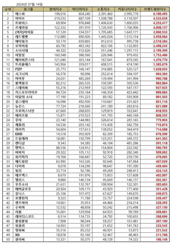 On June 14, the Korean Business Research Institute unveiled the top 50 Kpop girl group brand reputation rankings for July 2024. Accordingly, aespa took the top spot, followed by IVE, TWICE, LE SSERAFIM, and (G)-IDLE in the top five. Discover more Kpop female groups that made waves in July 2024!
