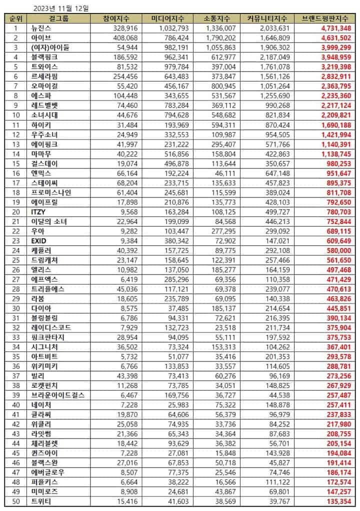 The Korean Business Research Institute has conducted a comprehensive analysis of consumer behavior specifically for Kpop female groups. They used 53,579,831 data points from October 12 to November 12, 2023. The analysis considered consumer participation, media coverage, interaction, and community indexes. Additionally, the institute obtained the brand reputation index for each group, which ultimately determined the rankings. However, there was an 8.04% increase in data points compared to the 49,593,553 recorded in October.