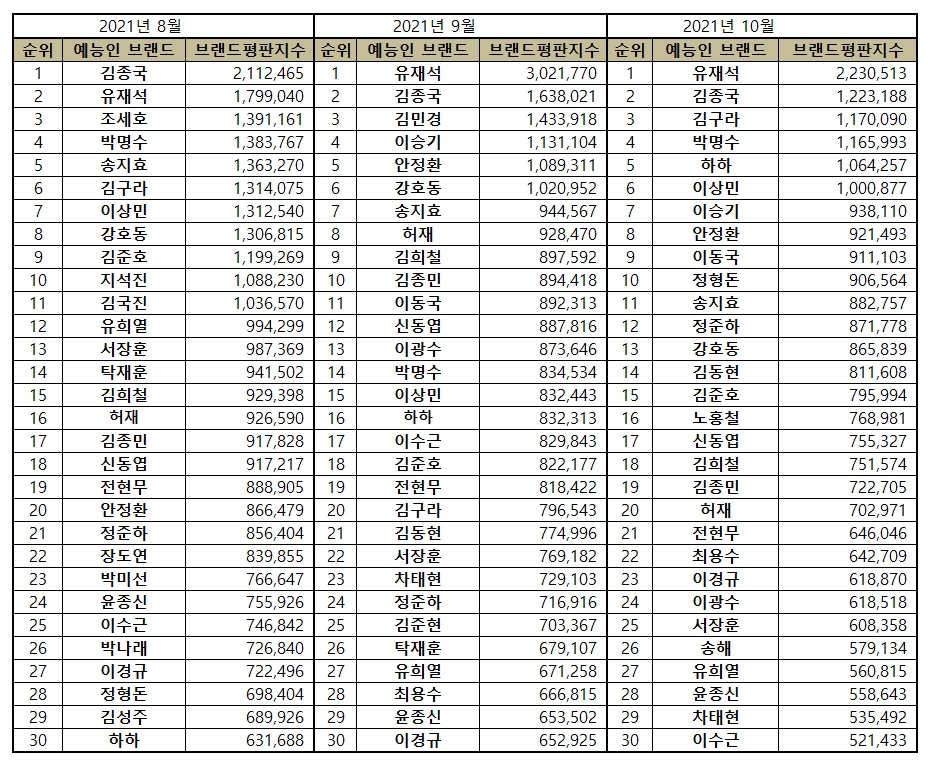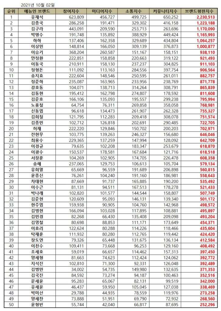 The Korea Corporate Reputation Research Institute has analyzed 33,364,965 big data of 50 brands of popular variety stars from September 2, 2021, to October 2, 2021. Compared to September variety star brand big data of 38,323,701, it decreased by 12.94 percent.