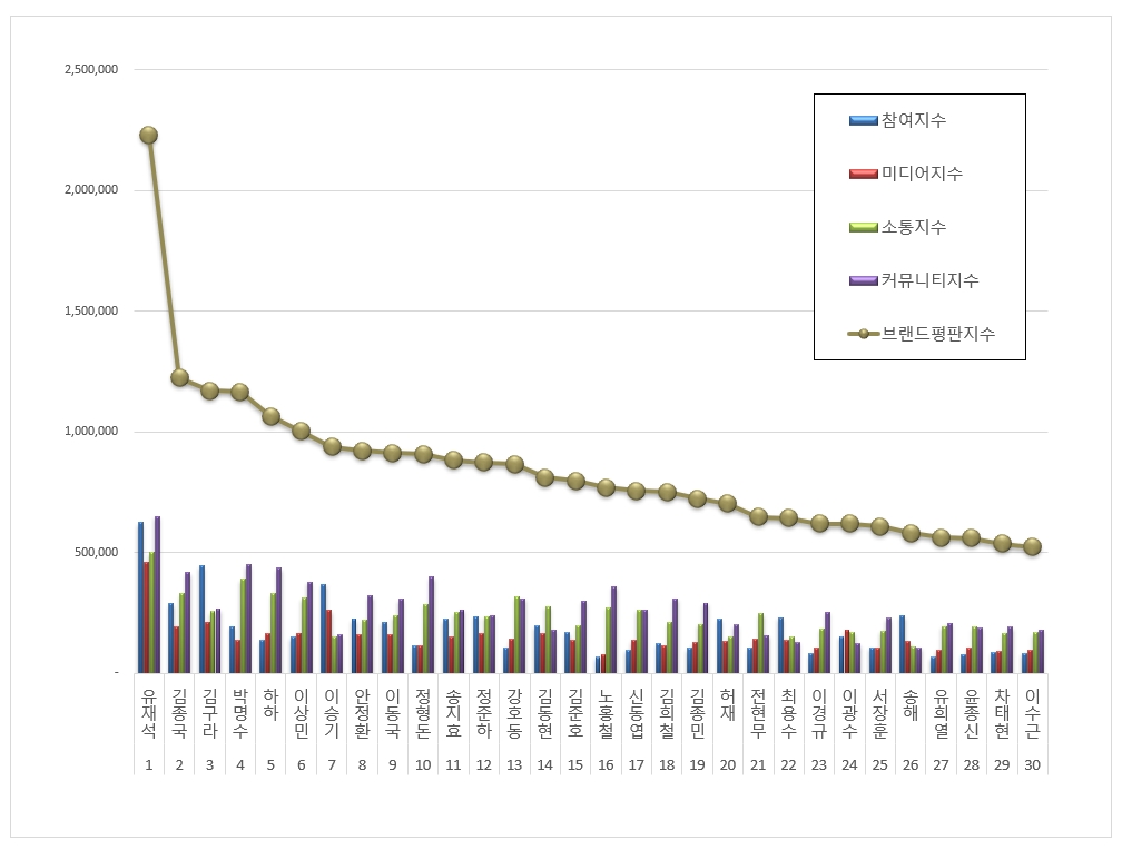 As a result, Yoo Jae Suk remained in first place with a brand reputation index of 2,230,513. In addition, Yoo Jae Suk’s positivity-negativity analysis showed a positive reaction score of 80.01 percent.