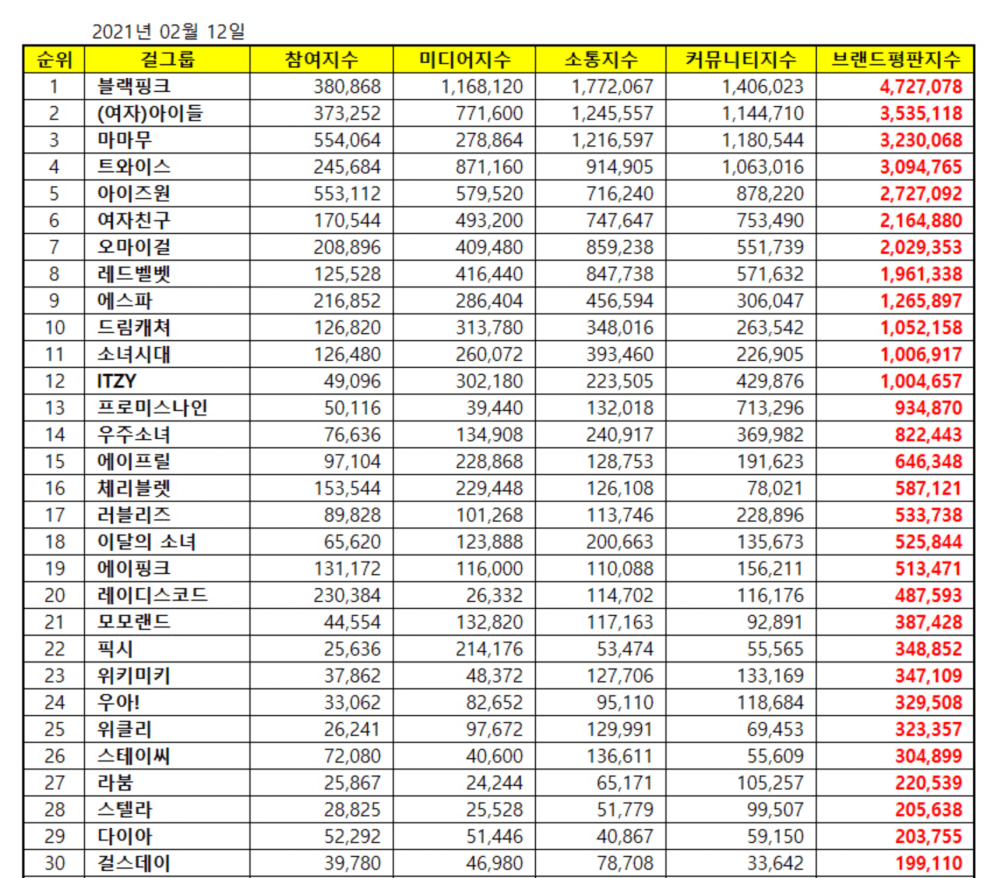 The Korean Business Research Institute has issued the most popular Kpop girl group in February 2021 Top 50 KPop Girl Group Popularity and Brand Reputation Rankings.